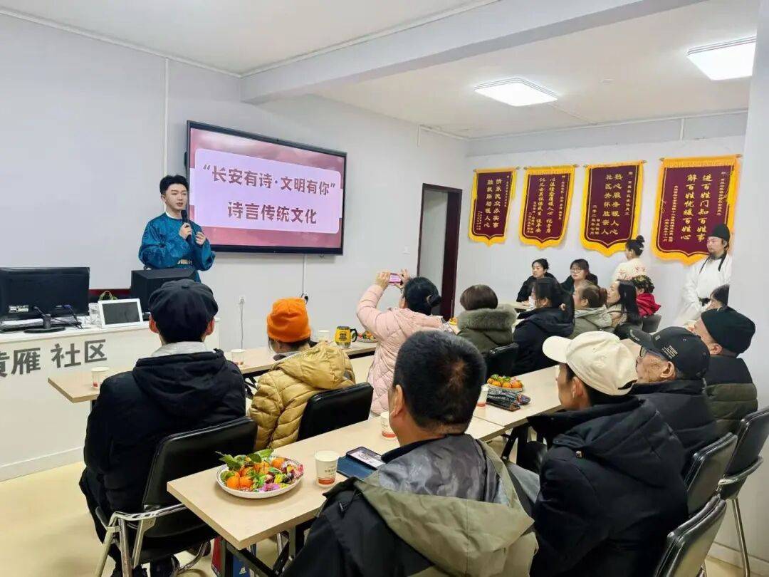 1月23日,“长安有诗·文明有你”唐诗主题诗享会活动,走进雁塔区华城社区新时代文明实践站。活动通过解读唐诗之都、唐诗互动对答、唐诗主题知识分享等内容形式,将流传上千年的唐诗融入到居民的日常生活中,让原本停留在书本上的诗句“活”了起来。