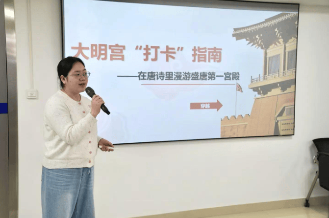 随后,来自心羽志愿服务中心的大学生志愿者高云丹带领居民“打卡”千年前的大明宫。“‘九天阊阖开宫殿,万国衣冠拜冕旒。’在诗人王维的笔下,丹凤门好像天上的宫门一样华丽,各国使者拜访都要经过丹凤门,展现了盛唐时期的长安对外开放、万国来朝的繁荣景象。”含元殿、麟德殿这些陌生的名字,通过古诗解读变得历历在目。