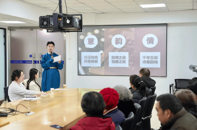 陕西国风专委会秘书长子虞把诗词巧妙地拆解为“意、韵、情”三个维度,带领现场居民展开了一场唐诗鉴赏之旅。“‘不知细叶谁裁出,二月春风似剪刀。’这句诗是作者记录生活美好的体现。”他认为,“诗词是古人留给我们的‘心情日记’和‘精神世界’,记录了他们的所见所闻、所思所感,我们翻开这本日记,不仅是为了了解他们的时代,更是为了在其中找到自己的影子”。